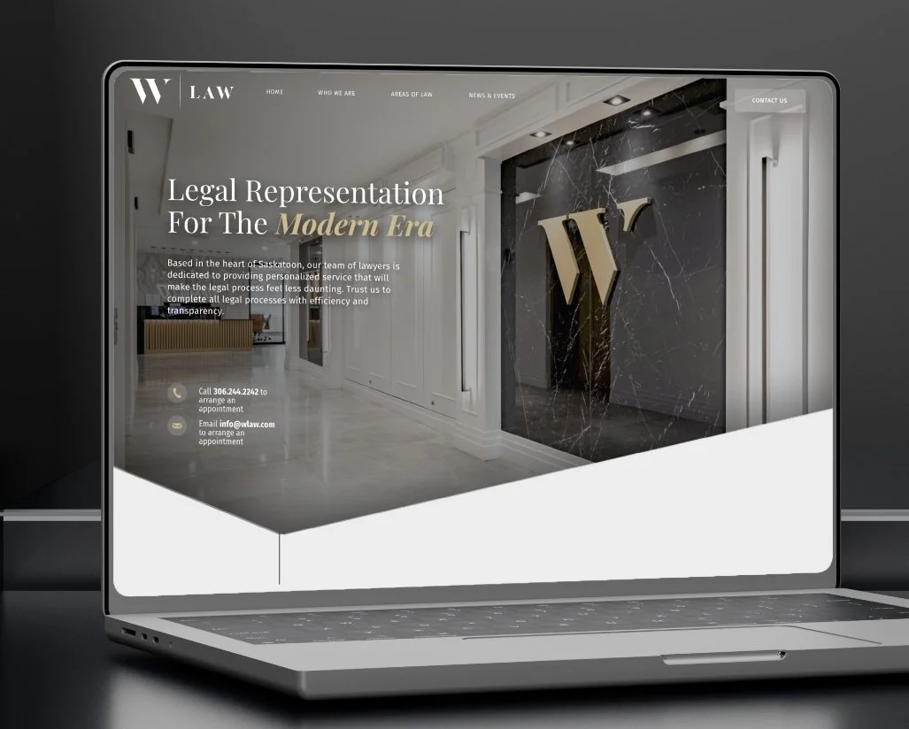 A comprehensive branding project for W Law, a Saskatoon law firm, seeking a refined and contemporary presence. I created a clean, luxurious identity using marble textures and floating gold motifs across their logo, print materials, social media, and website. The redesign received recognition, winning the 2023 Netty Awards for Best Legal Website and Best Visual Design. View Project >